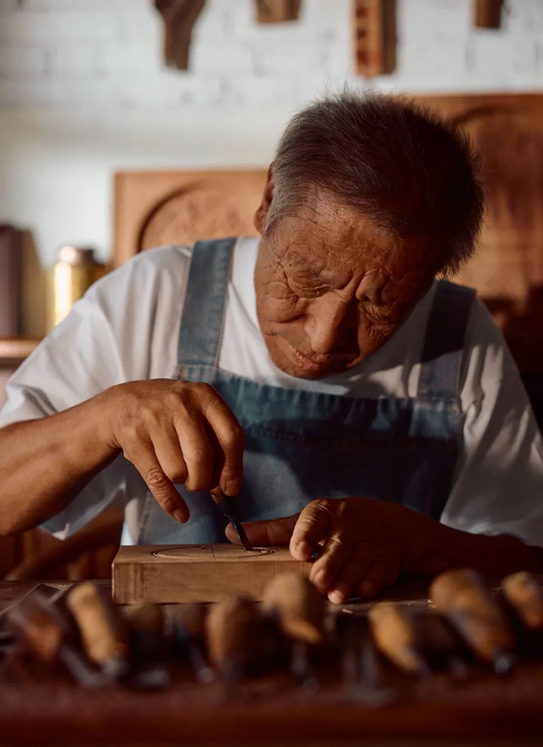 在孝义市兑镇镇前岭村的一处农家院落里,原提明师傅和妻子正在一锤一凿地雕琢木料。他们手下诞生的各式各样月饼模具,在两寸梨木上雕出了生活的百态和团圆的美好。